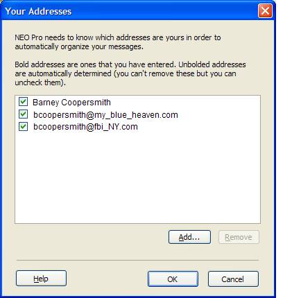 NEO needs to know which addresses are yours in order to automatically organize your messages. If all your addresses are not entered, your messages will not appear correctly.