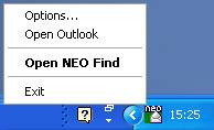 Right-clicking the NEO Find icon in the System Tray opens a small menu: