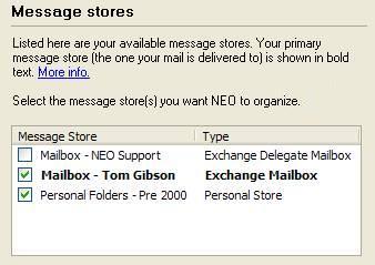 Note: If you change the message stores that are in your Outlook profile, you must restart NEO (the message stores available to NEO are only determined when NEO starts).